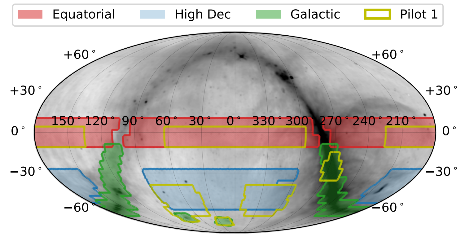 We conducted our Phase I Pilot Survey between August 2019 and August 2020. The survey was conducted at 888 MHz and used the RACS low-band footprint as a basis. The sky coverage compared to other ASKAP pilot surveys is shown below (the VAST footprint is outlined in aqua).